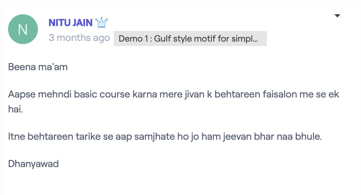 Hello Ma'am 😊 Mahendi Mixology class join kar ke bahut acha laga itni saari information mili bata nhi sakti Ager ye class miss ho jaata to main bahut kuch miss kar deti yakin maane ye class mere liye bahut hi helpful raha or umeed karti hu ki aage bhi is tarah ki achi achi information milti rahe .Thank u so much dear Ma'am 🙏🙏🙏